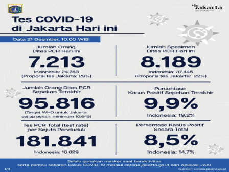 Kepala Bidang Pencegahan dan Pengendalian Penyakit, Dinas Kesehatan Provinsi DKI Jakarta, Dwi Oktavia memaparkan, berdasarkan data terkini Dinas Kesehatan Pemerintah Provinsi DKI Jakarta, dilakukan tes PCR sebanyak 8.189 spesimen. Dari jumlah tes tersebut, sebanyak 7.213 orang dites PCR hari ini untuk mendiagnosis kasus baru dengan hasil 1.151 positif dan 6.062 negatif.