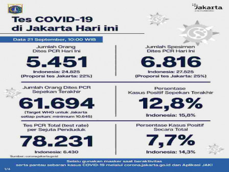 Untuk positivity rate atau persentase kasus positif sepekan terakhir di Jakarta sebesar 12,8%, sedangkan persentase kasus positif secara total sebesar 7,7%. WHO juga menetapkan standar persentase kasus positif tidak lebih dari 5%.