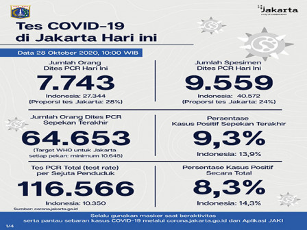 Kepala Bidang Pencegahan dan Pengendalian Penyakit, Dinas Kesehatan Provinsi DKI Jakarta, Dwi Oktavia memaparkan, berdasarkan data terkini Dinas Kesehatan Pemerintah Provinsi DKI Jakarta, dilakukan tes PCR sebanyak 9.559 spesimen. Dari jumlah tes tersebut, sebanyak 7.743 orang dites PCR hari ini untuk mendiagnosis kasus baru dengan hasil 793 positif dan 6.950 negatif.