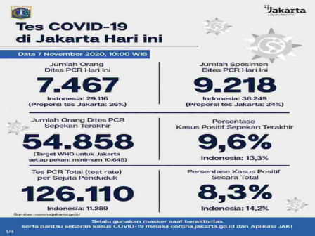 Kepala Bidang Pencegahan dan Pengendalian Penyakit, Dinas Kesehatan Provinsi DKI Jakarta, Dwi Oktavia memaparkan, berdasarkan data terkini Dinas Kesehatan Pemerintah Provinsi DKI Jakarta, dilakukan tes PCR sebanyak 9.218 spesimen. Dari jumlah tes tersebut, sebanyak 7.467 orang dites PCR hari ini untuk mendiagnosis kasus baru dengan hasil 747 positif dan 6.720 negatif.