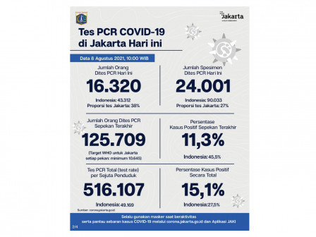 Perkembangan Data Kasus dan Vaksinasi COVID-19 di Jakarta Per 8 Agustus Mediaonline.co.id8 Agustus 20218 Agustus 2021 Pemprov DKI Jakarta masih terus berupaya… Pos terkaitDialog dengan Pelaku UMKM Kampung Singkong, Wapres Apresiasi Proses Produksi yang Inovatif dan HigienisTerima Mahasiswa Sosiologi Universitas Airlangga, Wapres Minta Generasi Muda Kawal Program Prioritas PresidenBertemu Jajaran Sea Soldier, Wapres Ajak Kampanyekan Isu Pelestarian Lingkungan Di Platform DigitalTinjau Pembelajaran Metode GASING Di Manokwari, Wapres Dorong Siswa Papua Cinta MatematikaTinjau Pasar Wosi Manokwari, Wapres Pastikan Stabilitas Harga Dan Kondisi Infrastruktur PasarBerbagi Kebahagian, Wapres Ajak Anak Yatim Di Manokwari Belanja Kebutuhan Sekolah