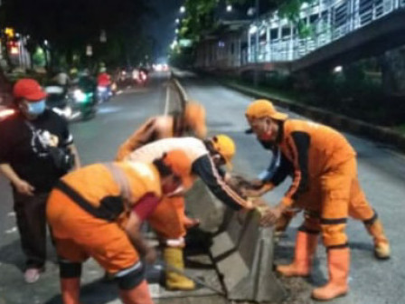 Petugas Penanganan Prasarana dan Sarana Umum (PPSU) Kelurahan Tomang dikerahkan untuk merapikan kembali sejumlah beton movable concrete barrier (MCB) busway di Jl Kyai Tapa, Tomang, Grogol Petamburan, Jakarta Barat.