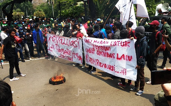 Pantauan JPNN.com di lokasi, dua spanduk dibawa massa GSM dalam aksi kali ini. Spanduk pertama berisi penolakan terhadap UU Cipta Kerja dan lainnya tentang kinerja Jokowi yang dinilai masih jeblok dalam memimpin Indonesia.