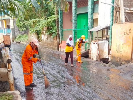 Ia menambahkan, untuk Jl Laning RT 04/03 dan RT 12/02 proses pembersihan dilakukan disepanjang 150 meter dengan ketebalan lumpur dan sampah satu sentimeter.