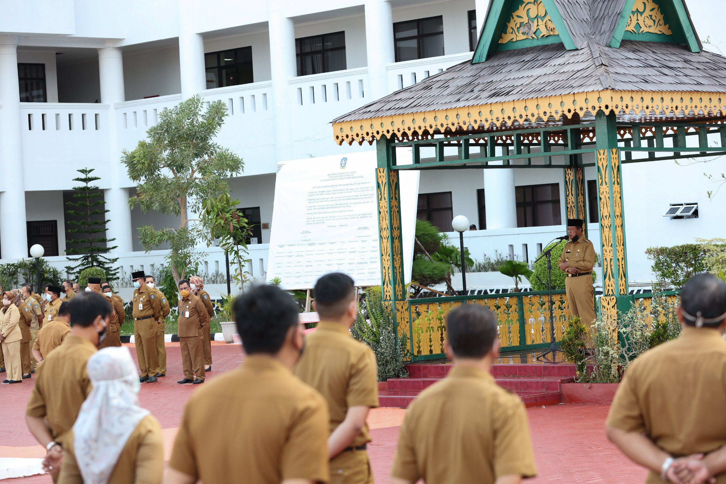 Gubernur Kepri, H. Isdianto menjadi pembina pada pelaksanaan apel pagi bersama Pejabat Struktural dan Fungsional di lingkungan Pemprov Kepri bertempat di lapangan kantor Gubernur, Dompak, Tanjungpinang, Senin (7/12).