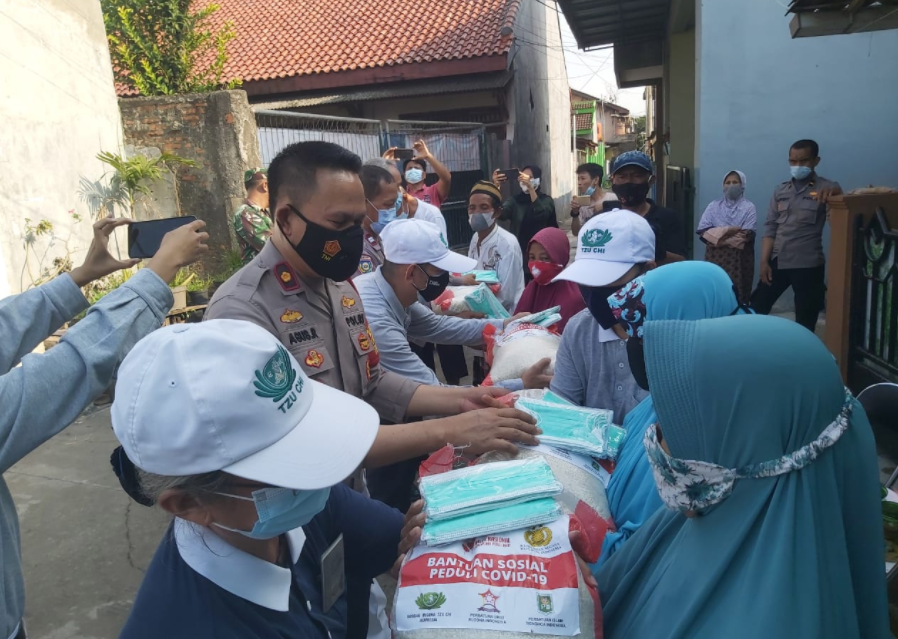 Jakarta – Polsek Medan Satria Polres Bekasi Kota bersama Yayasan Kemanusiaan Buddha Tzu Chi menggelar bantuan sosial untuk masyarakat yang terdampak covid – 19 di wilayah Medan Satria.