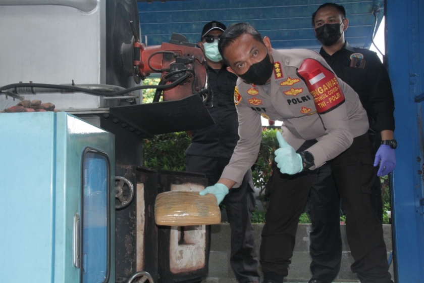 Ratusan kilogram narkotika tersebut dimusnahkan langsung menggunakan sebuah mobil incinerator.