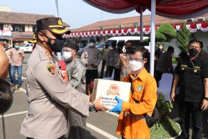 Jakarta-Polres Metro Tangerang Kota dan jajaran mendistribusi ratusan paket sembako secara langsung kepada warga kota Tangerang. Jum’at (25/6/2021).