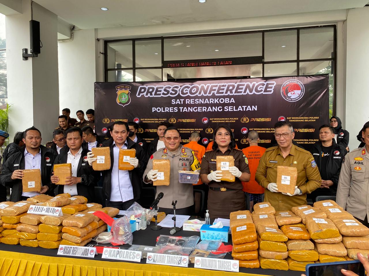 “hari ini polres tangsel melaksanakan konferensi pers pengungkapan narkotika jenis ganja seberat 140,4 Kg, dimana kejadian pada Jumat tanggal 09 Agustus 2024 dengan TKP di Jl. Raya Serang-Bitung, Kel. Kadu Jaya, Kec. Curug, Kabupaten Tangerang”jelas AKBP Ibnu Bagus.
