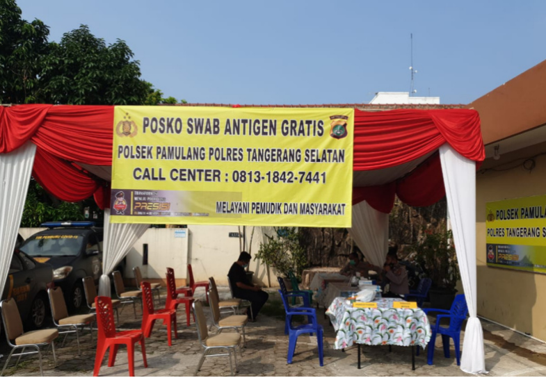 Jakarta – Polsek Pamulang Tangerang Selatan di bantu tenaga kesehatan dari Puskesmas melayani Swab Antigen gratis bagi para pemudik dan warga sekitar pasca hari raya idul Fitri 1442 H dan libur panjang.