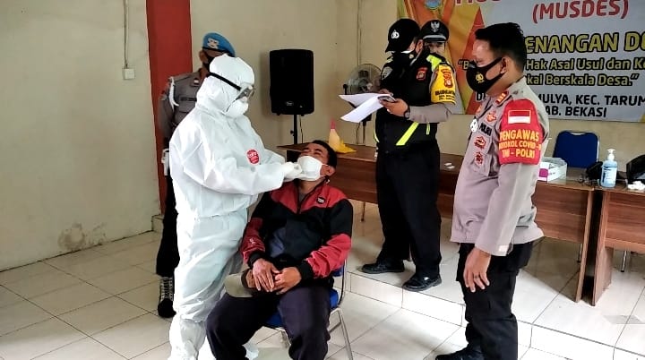 Jakarta – Polsek Tarumajaya melaksanakan Test Sweb Antigen di Posko Kampung Tangguh Jaya Ds. Setia Mulya Kec. Tarumajaya Kab. Bekasi.