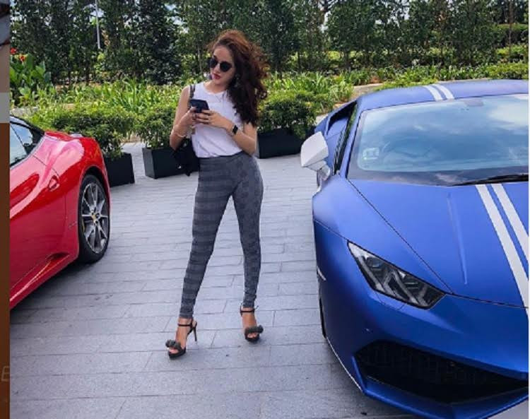 Dalam unggahah foto di Instagram miliknya, Hana berpose sambil berdiri sambil memegang smartphone dengan salah satu supercar mewah asal Italia yaitu Lamborghini.