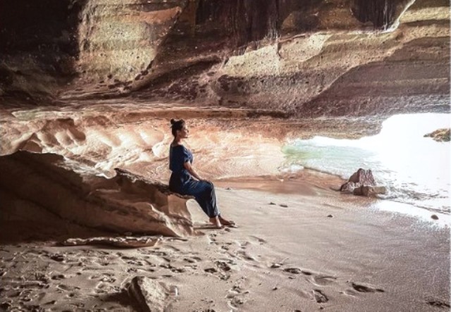 Perempuan bernama lengkap Titania Aurelie Nurhermansyah itu membagikan foto saat dirinya tengah berpose di pinggir pantai sambil duduk di bebatuan di sebuah gua.