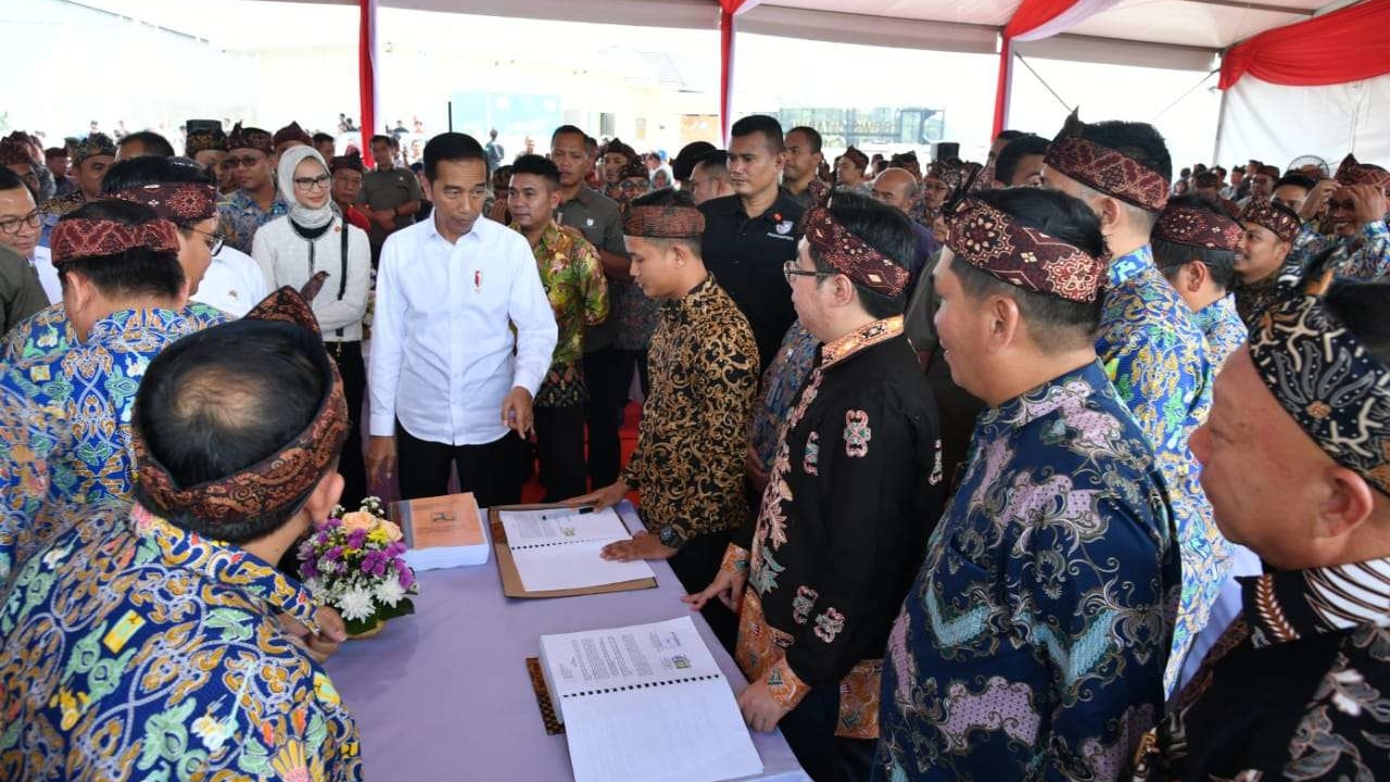 Presiden Joko Widodo menyampaikan apresiasi atas penandatanganan kurang lebih 1.300 kontrak kerja proyek-proyek nasional di lingkungan Kementerian Pekerjaan Umum dan Perumahan Rakyat (PUPR) untuk tahun anggaran 2020. Penandatanganan kontrak kerja dari 100 perwakilan pihak yang terlibat disaksikan langsung oleh Presiden bersamaan dengan acara peresmian terowongan Nanjung di Kabupaten Bandung, Jawa Barat, pada Rabu, 29 Januari 2020.