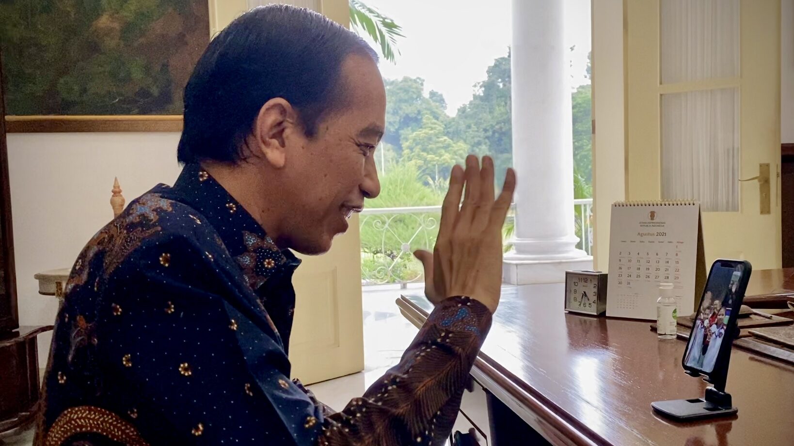 Presiden RI melakukan panggilan video dengan Greysia Polii dan Apriyani Rahayu melalui panggilan video yang dilakukan Presiden dari Istana Kepresidenan Bogor, Jawa Barat, pada Senin, 2 Agustus 2021.