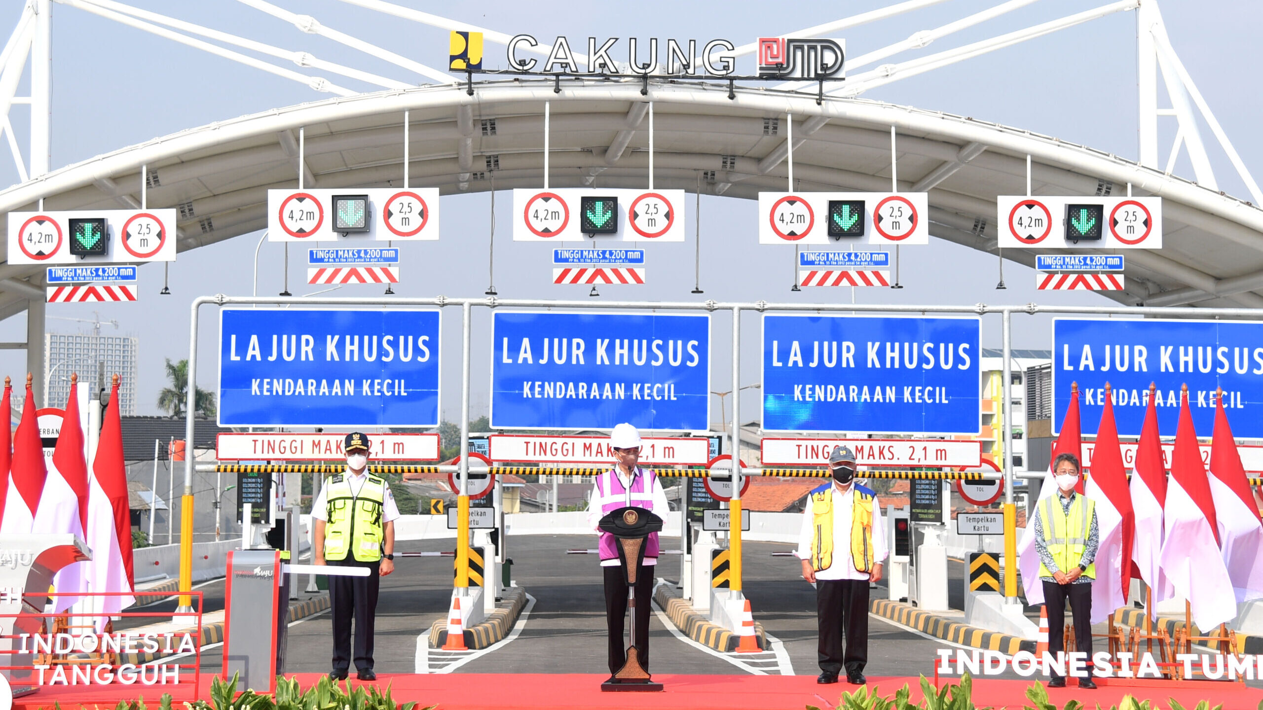 Presiden Republik Indonesia, Joko Widodo meresmikan enam ruas jalan tol dalam kota Jakarta segmen Kelapa Gading-Pulo Gebang sepanjang 9,3 kilometer di Gerbang Tol Cakung, Jakarta Timur, pada Senin, 23 Agustus 2021.