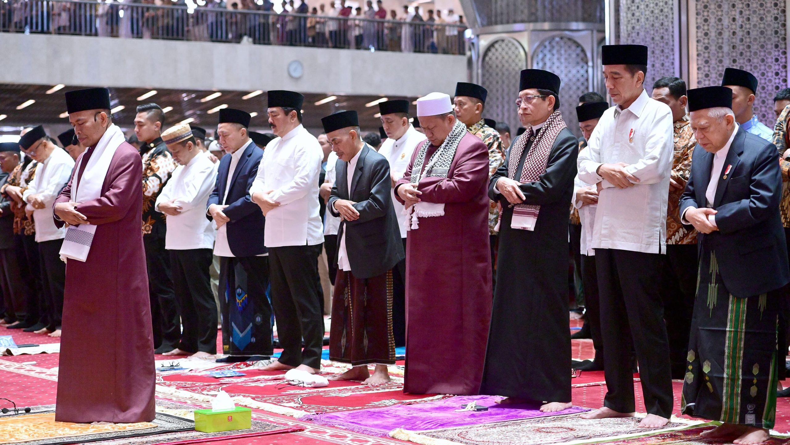 Presiden Jokowi tampak hadir mengenakan baju koko berwarna putih dan Ibu Iriana mengenakan pakaian muslim berwarna putih. Sesaat setelah tiba, Presiden pun langsung menempati saf paling depan, sementara Ibu Iriana menempati saf bagi jemaah wanita yang berada di sisi kiri ruang utama masjid.
