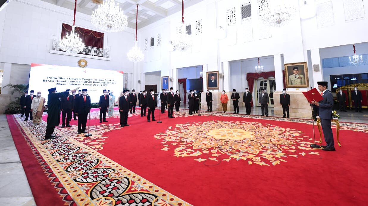 Presiden Joko Widodo melantik dan mengambil sumpah jabatan Dewan Pengawas beserta Direksi Badan Penyelenggara Jaminan Sosial (BPJS) Kesehatan dan BPJS Ketenagakerjaan untuk masa jabatan tahun 2021-2026. Acara pelantikan berlangsung di Istana Negara, Jakarta, pada Senin, 22 Februari 2021.
