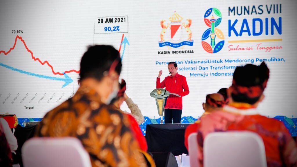 “Kunci dari urusan ekonomi yang kita hadapi ini adalah bagaimana Covid ini dikurangi, ditekan agar hilang dari Bumi Pertiwi ini,” ujar Presiden saat memberikan sambutan pada pembukaan Musyawarah Nasional (Munas) VIII Kamar Dagang dan Industri (Kadin) Tahun 2021 yang digelar di halaman Masjid Al-Alam, Kota Kendari, Provinsi Sulawesi Tenggara, Rabu, 30 Juni 2021.