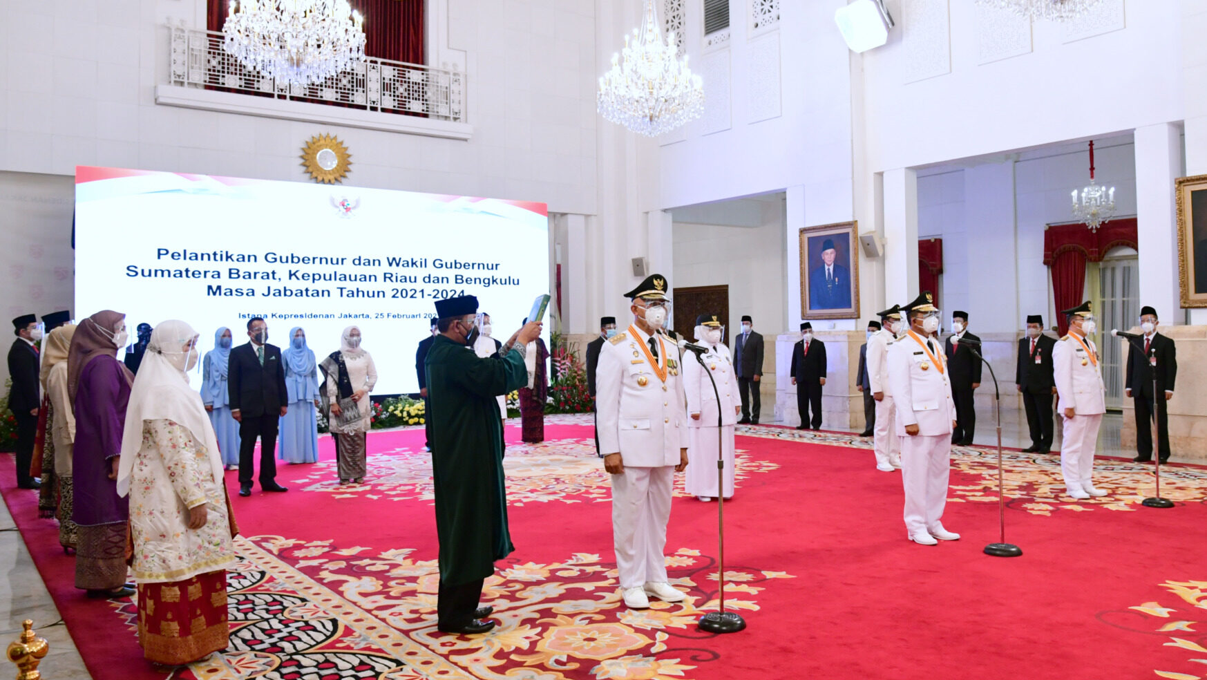 Presiden Republik Indonesia, Joko Widodo, melantik Gubernur dan Wakil Gubernur Provinsi Sumatera Barat, Kepulauan Riau, dan Bengkulu masa jabatan tahun 2021-2024 di Istana Negara, Jakarta pada Kamis, 25 Februari 2021.