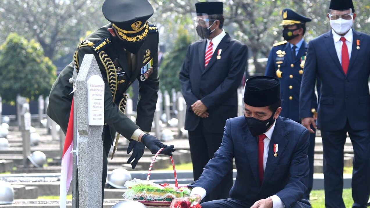 Presiden Jokowi memimpin upacara Ziarah Nasional dalam rangka Peringatan Hari Pahlawan tahun 2020 di Taman Makam Pahlawan (TMP) Nasional Utama Kalibata, Jakarta Selatan, Selasa, 10 November 2020.