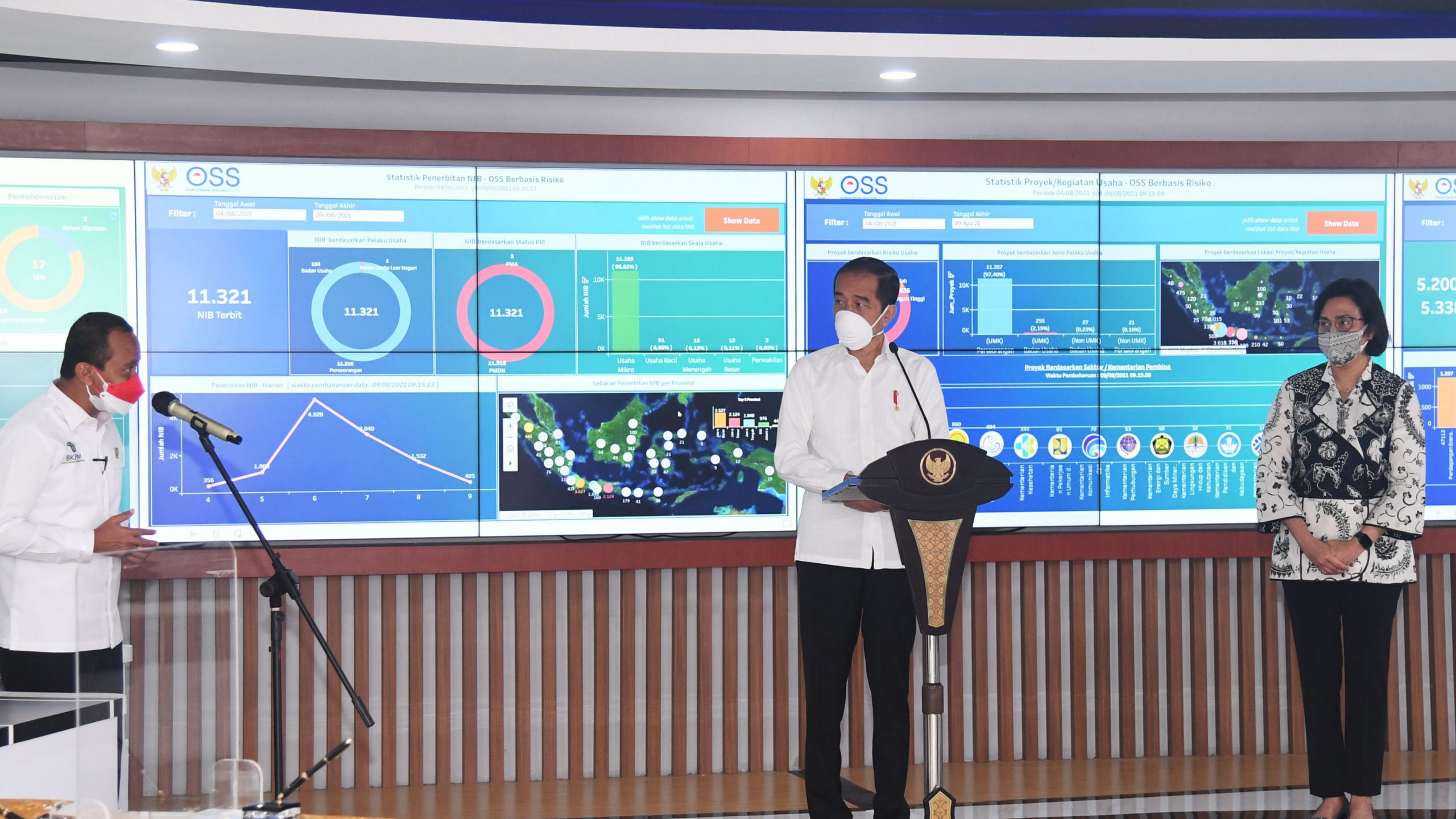 Presiden Joko Widodo meresmikan peluncuran Online Single Submission (OSS) berbasis risiko dalam perizinan berusaha, pada Senin, 9 Agustus 2021, di Pusat Komando Operasi dan Pengawalan Investasi, Kementerian Investasi/Badan Koordinasi Penanaman Modal (BKPM), Jakarta.