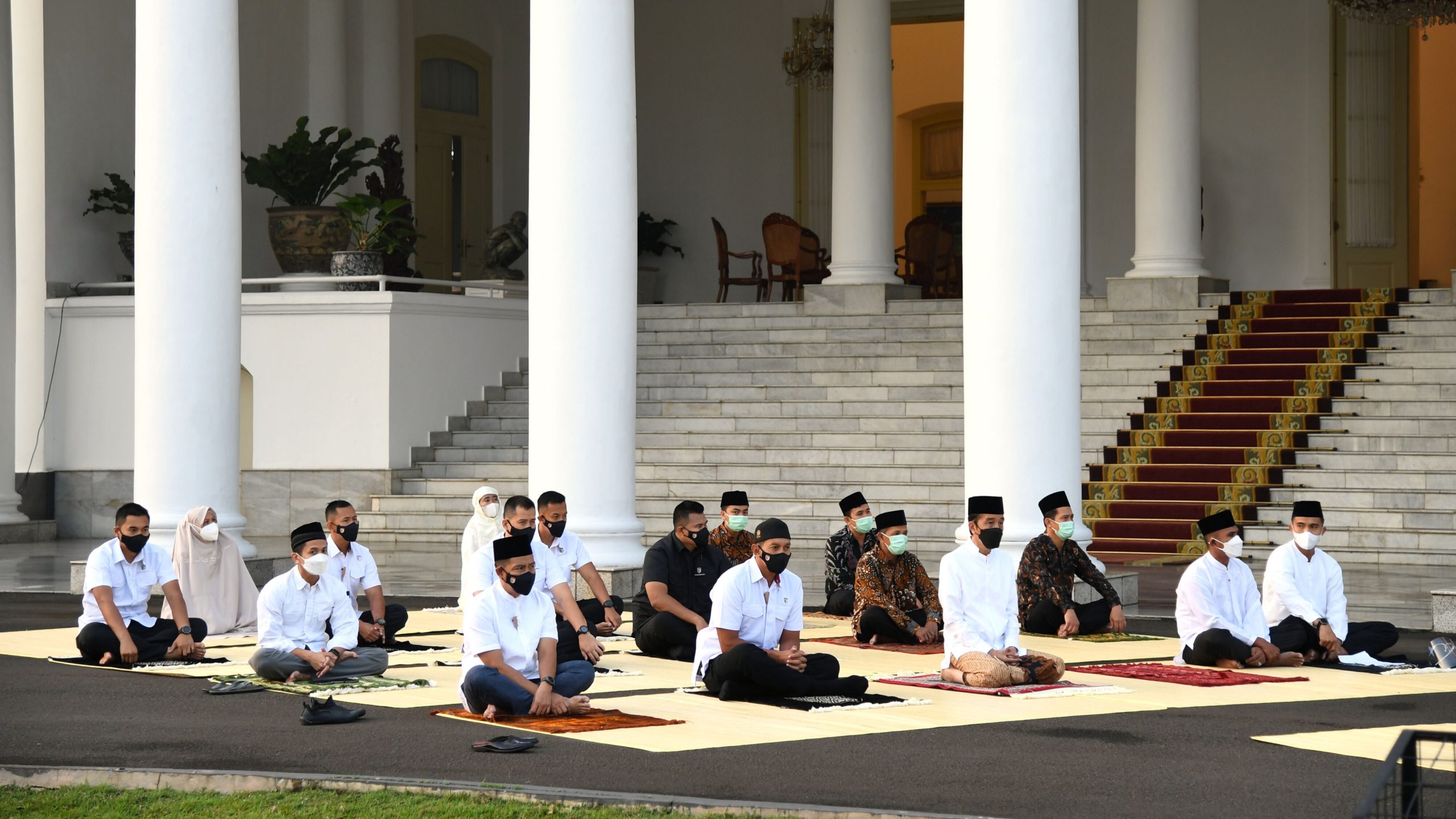 Presiden Republik Indonesia, Joko Widodo dan Ibu Negara Iriana Joko Widodo melaksanakan salat Idulfitri 1442 H di halaman Gedung Induk Istana Kepresidenan Bogor, Jawa Barat pada Kamis, 13 Mei 2021.