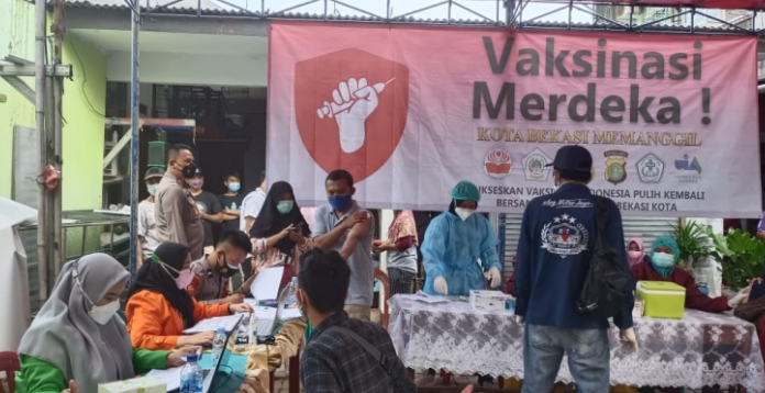 Kegiatan vaksinasi secara gratis ini dilakukan di empat kawasan. Antara lain, Gerai Vaksin Merdeka di Kantor Seketariat Rw 15 Kelurahan Pejuang Kecamatan Medan Satria Kota Bekasi, Senin (02/08/2021).