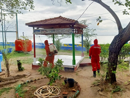 Petugas Sektor 8 Suku Dinas Penanggulangan Kebakaran dan Penyelamatan (Sudin Gulkarmat) Jakarta Utara dan Kepulauan Seribu melakukan penyemprotan disinfektan di Ruang Publik Terpadu Ramah Anak (RPTRA) Amiterdam, Kelurahan Pulau Untung Jawa, Kecamatan Kepulauan Seribu Selatan.