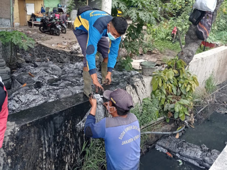 Satuan Pelaksana Sumber Daya Air (Satpel SDA) Kecamatan Tanjung Priok, Jakarta Utara melakukan pengerukan saluran sepanjang satu kilometer di Jalan…