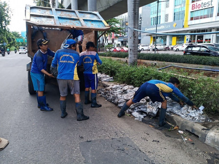 Suku Dinas Sumber Daya Air (SDA) Jakarta Utara tengah melakukan pengangkutan lumpur di saluran Penghubung (Phb) Boulevard Selatan, Jalan Boulevard Raya, Kelapa Gading.