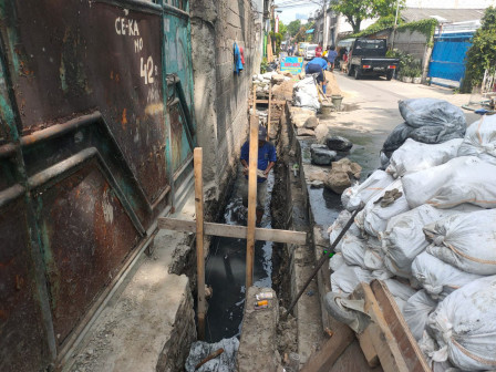 Satuan Pelaksana (Satpel) Sumber Daya Air Kecamatan Tanjung Priok, Jakarta Utara melakukan perbaikan turap saluran di Jalan Telaga Raya, RT…