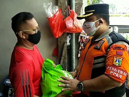 Satuan Polisi PP Kelurahan Bungur, Kecamatan Senen, Jakarta Pusat, membagikan puluhan paket sembako kepada pedagang kaki lima (PKL) yang terkena…