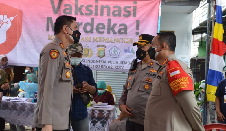 Bekasi – Kapolres Metro Bekasi Kota (Kombes. Pol. Aloysius Suprijadi) meninjau pelaksanaan vaksinasi di ruko Sentra Niaga, Kelurahan Kayuringin Jaya, Bekasi Selatan, Senin (02/08/2021).