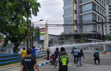 Pasukan kepolisian yang terdiri Satuan Brimob dan TNI kembali memukul mundur para mahasiswa menggunakan water cannon dan gas air mata.