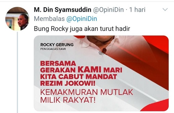 Ada juga foto Rocky Gerung, dengan narasi yang sama, yakni mengajak rakyat untuk mencabut mandat Jokowi. “Bersama gerakan KAMI, mari kita cabut mandat rezim Jokowi, kemakmuran mutlak milik Rakyat.” Demikian bunyi unggahan itu.