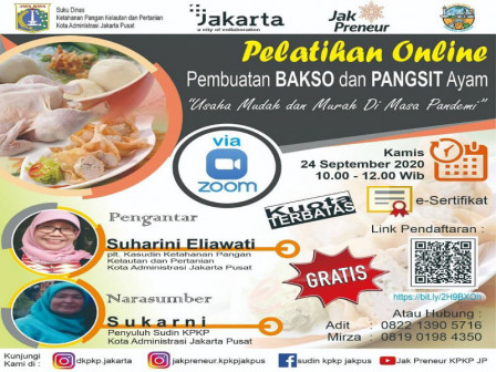Suku Dinas (Sudin) Ketahanan Pangan Kelautan dan Perikanan (KPKP) Jakarta Pusat membuka pendaftaran untuk pelatihan online pembuatan bakso dan pangsit ayam.