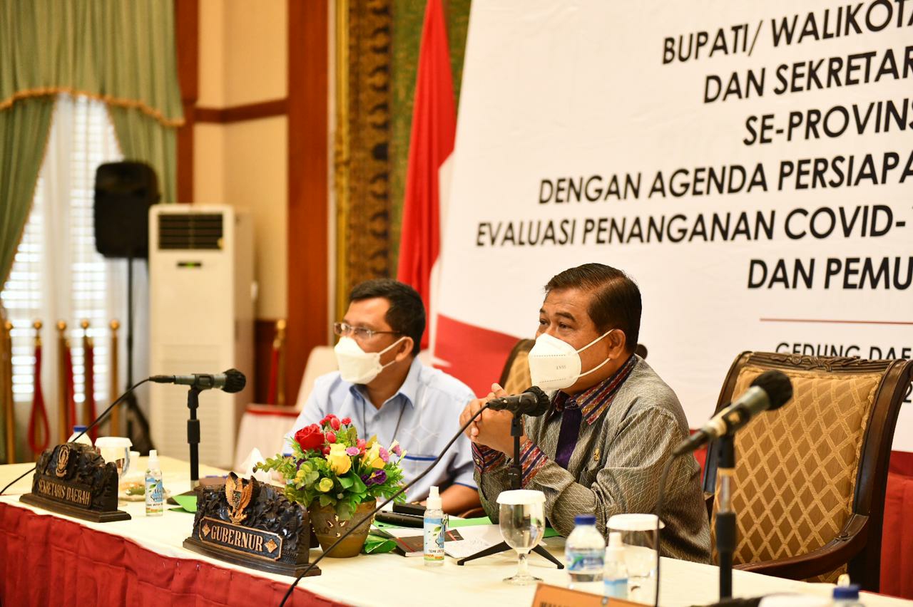 Kepada Bupati/ Walikota baik definitif maupun Plh, Suhajar di kesempatan ini kembali menyampaikan pesan dari Presiden melalui Menteri Dalam Negeri untuk terus mengendalikan dan memprioritaskan laju pertumbuhan atau laju penularan Covid-19 ini, dengan memastikan semua kegiatan mematuhi protokol kesehatan yaitu patuh terhadap 3M, memakai masker, menghindari kerumunan dan mencuci tangan.