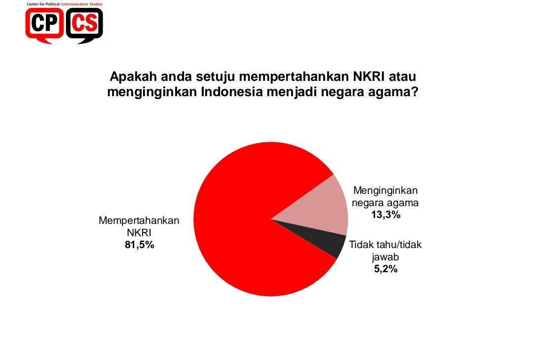 Mediaonline.co.id, JAKARTA – Survei yang dilakukan Center for Political Communication Studies (CPCS) menunjukkan sebagian besar masyarakat masih mendukung konsep NKRI yang berlandaskan Pancasila. Sebanyak 81,5 persen responden menyatakan mendukung NKRI dipertahankan.Hanya 13,3 persen yang menginginkan Indonesia berubah jadi negara agama alias teokrasi. Sedangkan 5,2 persen menyatakan tidak tahu/tidak jawab.