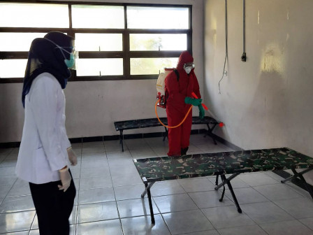 Petugas Sektor 8 Suku Dinas Penanggulangan Kebakaran dan Penyelamatan (Sudin Gulkarmat) Jakarta Utara dan Kepulauan Seribu melakukan penyemprotan cairan disinfektan di gedung SMPN 288 Jakarta, Pulau Lancang, yang dijadikan lokasi isolasi COVID-19 di Kelurahan Pulau Pari.