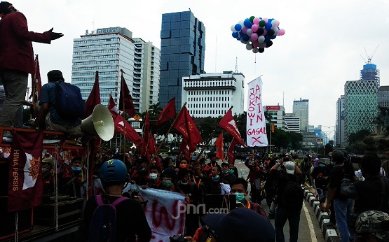 Mediaonline.co.id, JAKARTA – Puluhan mahasiswa yang tergabung dalam Himpunan Mahasiswa Persatuan Islam (HIMA Persis), menggelar demonstrasi menolak UU Cipta Kerja (Ciptaker) di area Patung Kuda, Jalan Medan Merdeka Barat, Rabu (28/10).