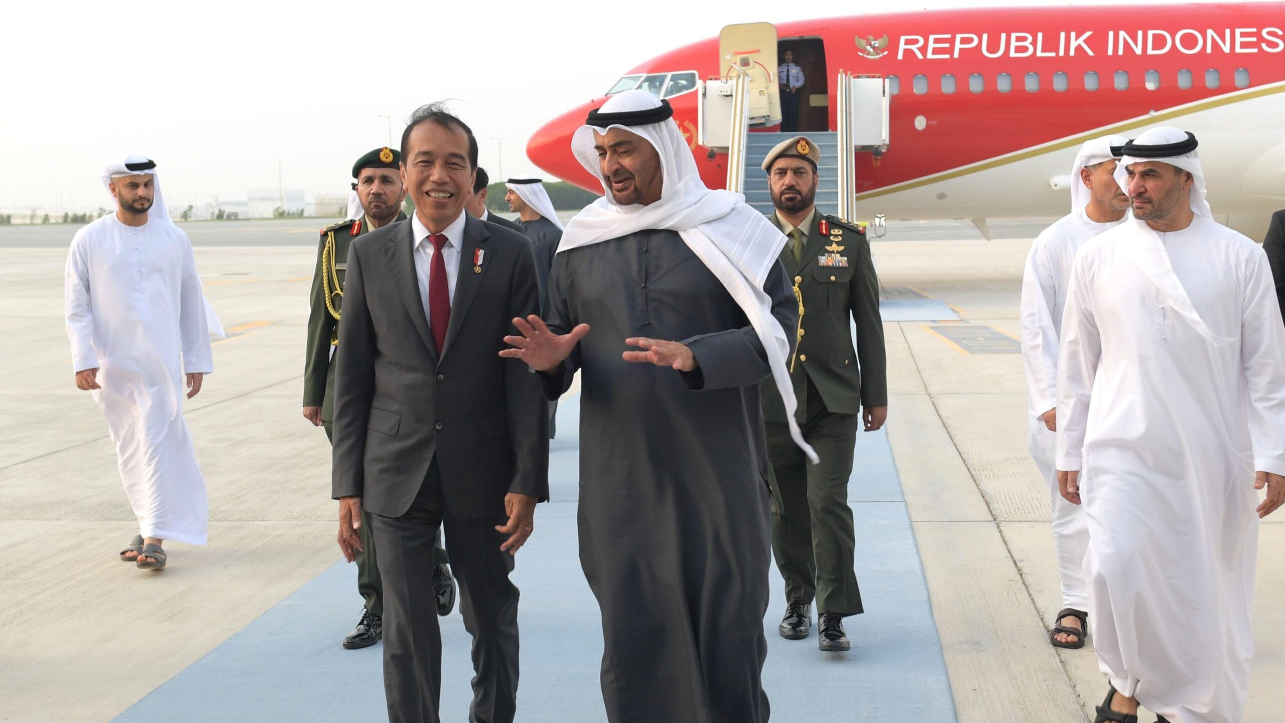 Usai menempuh perjalanan sekitar 8,5 jam dari Indonesia, Presiden Joko Widodo tiba di Bandara Internasional Zayed, Abu Dhabi, Persatuan Emirat Arab (PEA) pada Selasa, 16 Juli 2024 sekitar pukul 18.30 waktu setempat. Penyambutan terasa istimewa karena Presiden PEA Mohammed bin Zayed Al Nahyan (MBZ) menyambut langsung kedatangan Presiden Jokowi di bandara tersebut.
