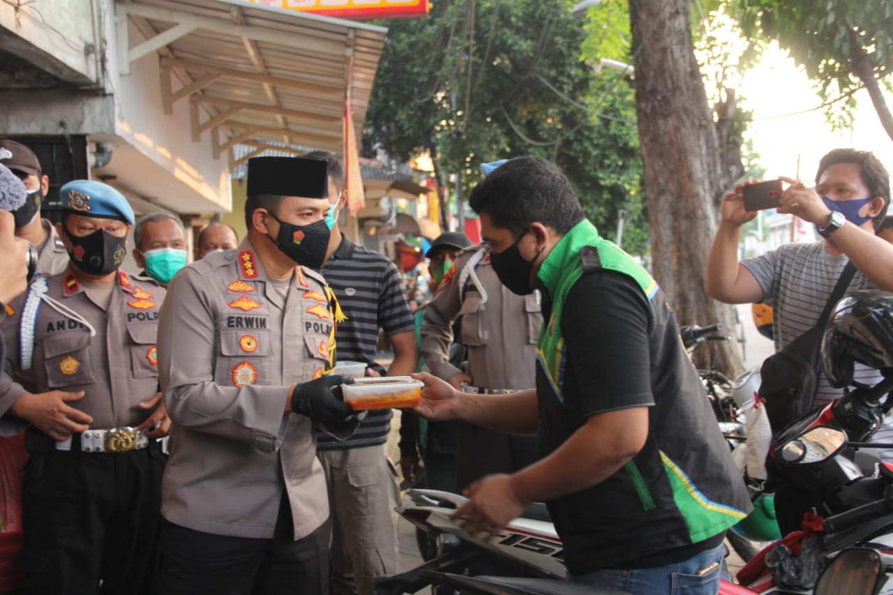 Kapolres Metro Jakarta Timur membagikan daging kurban yang sudah di masak menjadi Daging Rendang untuk ojek dan ojol yang sedang mangkal.