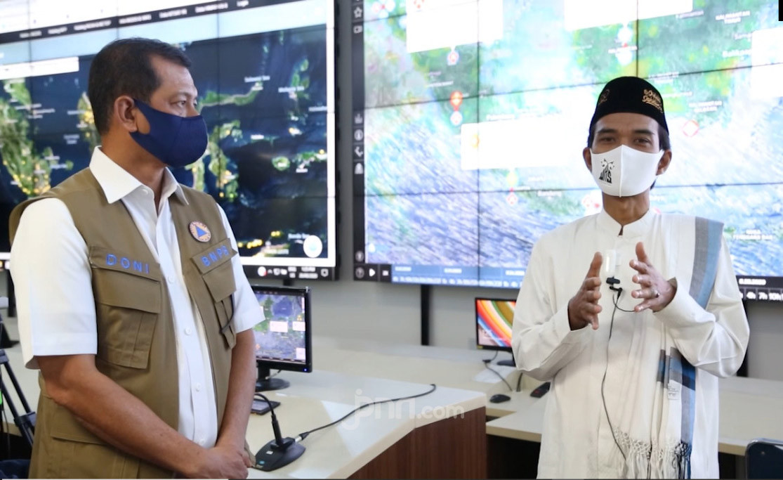 Keduanya pun mengenakan masker. Jenderal Doni mengenakan seragam BNPB. Sedangkan UAS pakai baju koko putih dan peci warna hitam.
