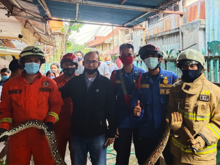 Ular sanca kembang sepanjang tiga meter berhasil dievakuasi petugas Sudin Gulkarmat Sektor IX Kecamatan Pasar Minggu, dari rumah warga di Jalan Jati Padang Raya, GG H. Saibun, RT 08/09 No.57, Kelurahan Jati padang, Senin (9/10).