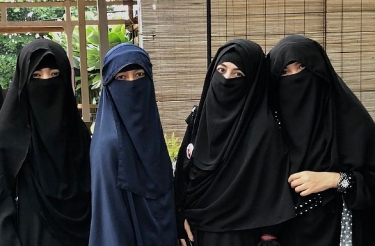 Santri yang disebut radikal ini mengenakan cadar sementara santri yang NKRI hanya mengenakan jilbab dengan memegan bendera merah putih.
