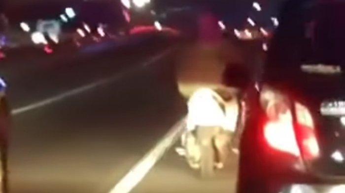 Pada video, terlihat pengendara motor memacu motornya di tengah jalan tol.