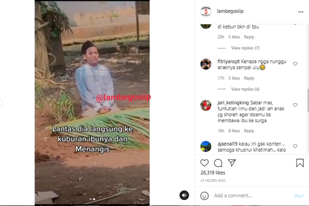 Video yang telah ditonton lebih dari 26 ribu pengguna instagram itu membuat warganet larut dlam kesedihan. “Dan dialah pahala jariyah ibunya. Doakan mas, dan jadikan drimu pahala yg tak trputus bagi ibumu. ??,” kata @fziakurnia.