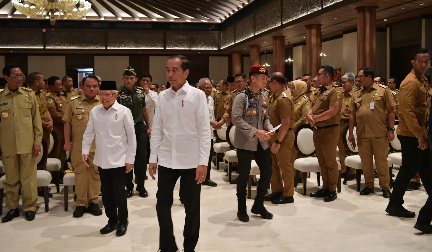 Hadir pada acara ini, para Gubernur dan Bupati/Wali Kota dari seluruh Indonesia. Sementara selain Wapres, tampak mendampingi Presiden, Menteri Sekretaris Negara Pratikno, Menteri Dalam Negeri Tito Karnavian, Menteri Pekerjaan Umum dan Perumahan Rakyat Basuki Hadimuljono, Sekretaris Kabinet Pramono Anung, Panglima TNI Jenderal TNI Agus Subiyanto, Kapolri Jenderal Pol. Listyo Sigit Prabowo, serta Wakil Menteri Agraria dan Tata Ruang Raja Juli Antoni. (EP/AS -rls)