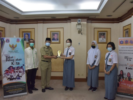 Wakil Wali Kota Jakarta Barat, Yani Wahyu Purwoko menyerahkan hadiah kepada para pemenang lomba Jakarta Baznas Bazis Entrepreneur dan Enpowerment (Jakbee) Business Proposal 2020 di kantor Walikota Jakarta Barat.